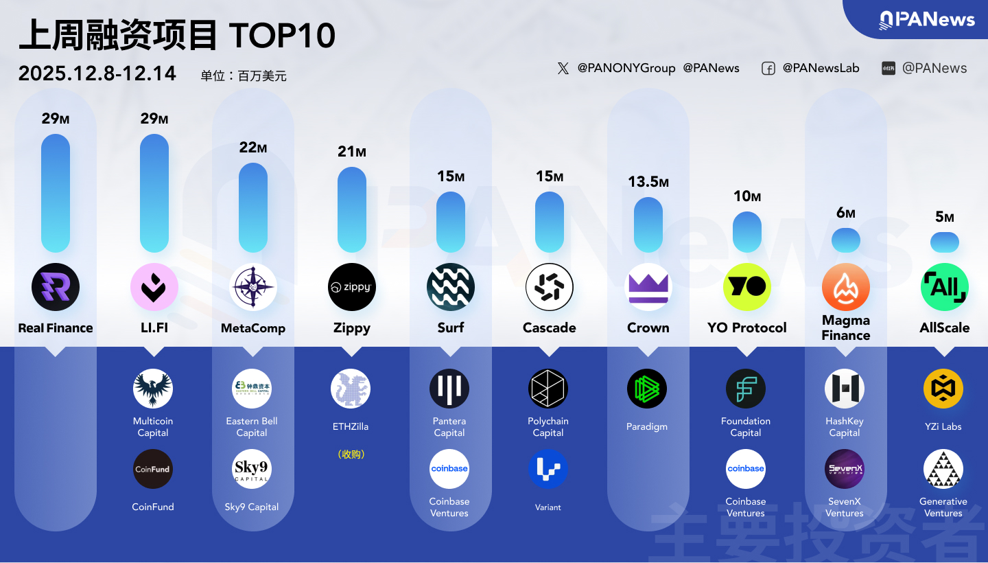 据 PANews 不完全统计,上周(12.8-12.14)全球区块链有19起投融资事件,资金总规模超1.78亿美元,概览如下概览如下: