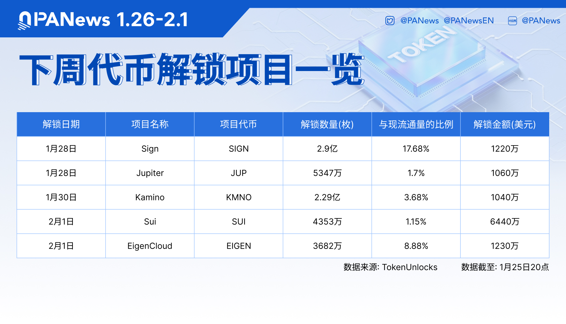 PANews 1月25日消息,Token Unlocks数据显示,SIGN、JUP等代币将于下周迎来大额解锁,其中: