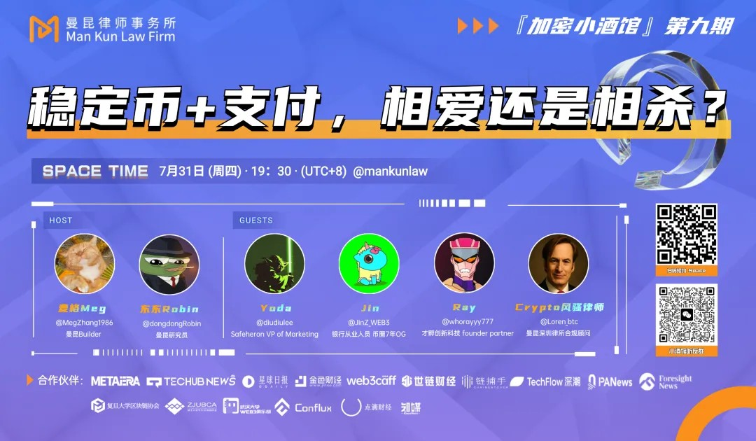 麦格Meg:欢迎来到加密小酒馆第9期!今天是小酒馆开业整整两个月,感谢大家支持!本期主题是“稳定币加支付,相爱还是相杀?”我们不代表律所或官方立场,而是以Web3从业者、Builder的视角,聊聊稳定币在支付领域的机会与挑战。简单介绍一下我自己:2017年入圈,之前做了7年传统金融,投融资出身,入圈后干过交易所、矿池、支付,从0到1参与多个项目,现在是妥妥的律所人。接下来请嘉宾自我介绍,先从风骚律师开始!