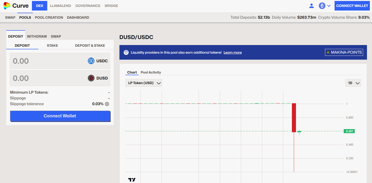 DUSD 是由多链 DeFi 执行引擎 Makina Finance 发行的稳定币。根据事后披露的信息,攻击者通过闪电贷借入约 2.8 亿美元的 USDC,在极短时间内操纵与该池相关的价格输入,虚增流动性头寸的账面价值,并在系统尚未来得及重新校准之前完成套利,最终将池中约 1,299 枚 ETH 等值资产全部转出。