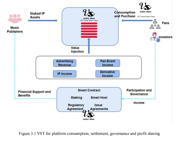 根据Voice Street的项目白皮书,VST涵盖了丰富的实际使用场景。作为致力于将音乐带入 Web3.0 的 Labs,Voice Street平台以 VST 进行音乐 NFT 产品发售。在版权收益池中、Ark of panda 元宇宙游戏中、Live House 在线演唱会、NFT 化道具等各类场景将使用VST作为定价和交换媒介。