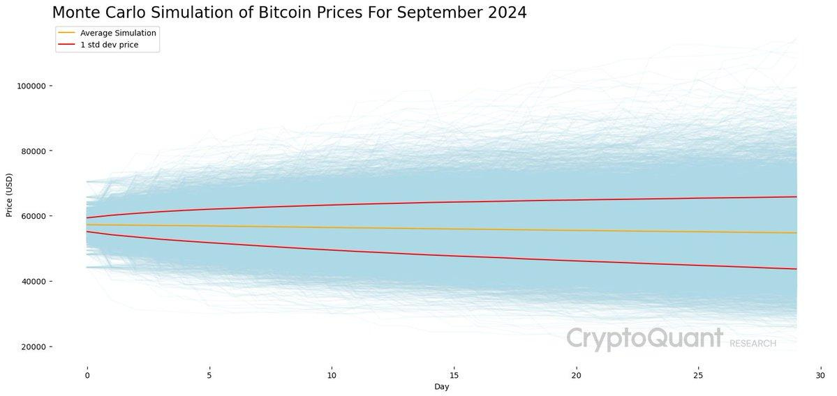 CryptoQuant 研究主管 Julio Moreno 发布了一项比特币 9 月价格走势的模拟预测。根据其模拟结果,比特币价格在 9 月可能会略有下降,月底价格预计在 55,000 美元左右。模拟图表显示,比特币价格大多数时间将在 44,000 美元到 66,000 美元之间波动。不过,Moreno 特别指出,这些模拟预测仅基于比特币历史上 9 月份的日收益率数据进行计算。